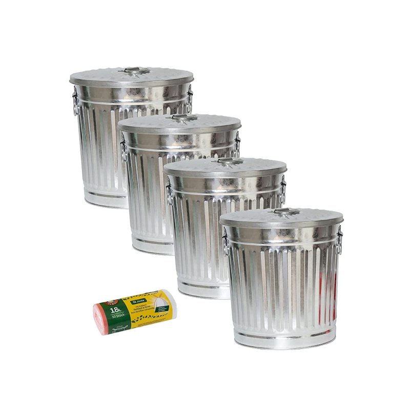 • 4er-Set Mülltonnen aus verzinktem Metall mit seitlichen Griffen und abnehmbarem Deckel + 1 Rolle mit 50 transparenten Müllbeuteln.
