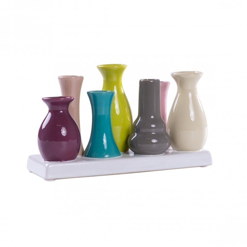 - 1 tray of 7 multicolored decorative ceramic vases.