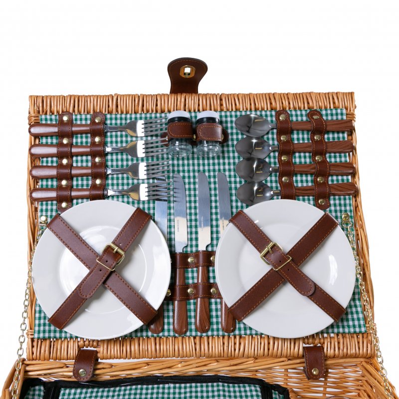 Weidengeflecht Picknickkorb mit Kühlfach & Zubehör-Geschirr, Besteck, Weingläser - Geschenkidee für Camping, Outdoor & Familie | Für 4 Personen | Grün