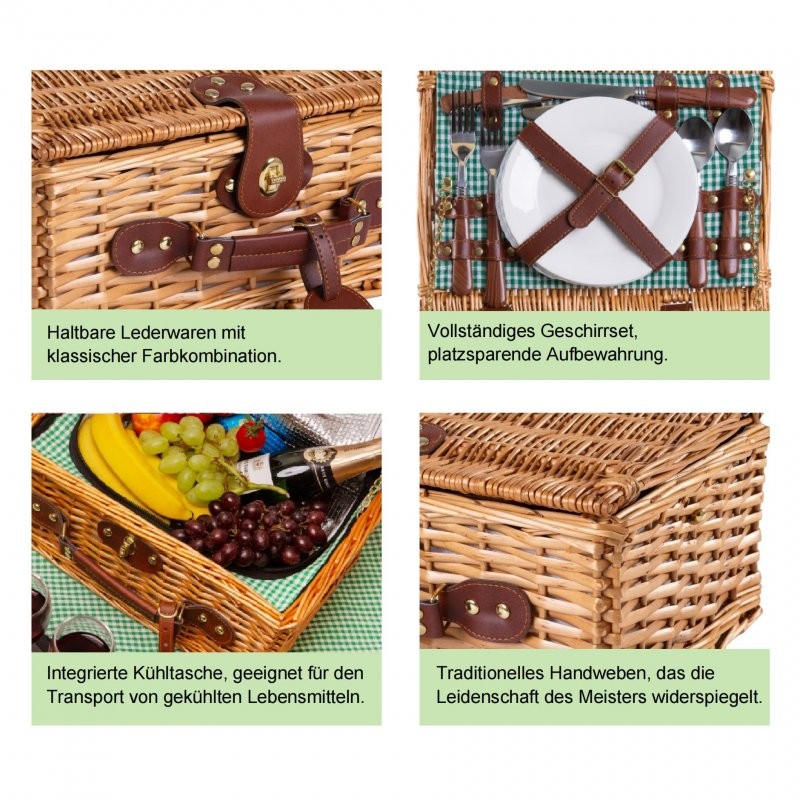 eGenuss Handgefertigtes Picknickkorb für 2 Personen ? Kühlfach, Multifunktionsmesser, Edelstahlbesteck, Teller und Weingläser inklusive - GRÜN Gingham-Muster